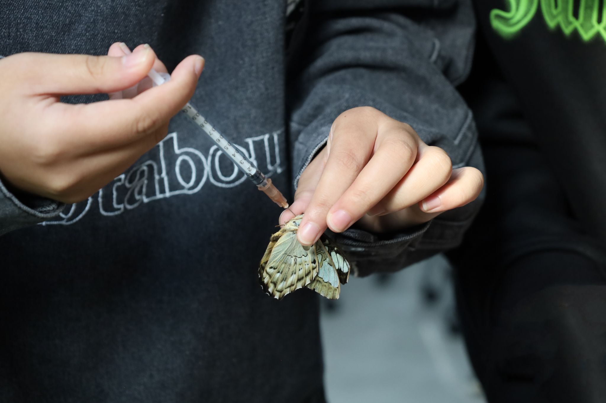 左手持原蝶标本,右手执注射器,将温水注射到原蝶体内直至原蝶软化,生物技术专业2023(2)班的刘保君担任此次活动的“小老师”,引导着员工制作蝴蝶标本。“用昆虫针固定原蝶时要尽量避免碰到蝴蝶的翅膀。”刘保君解释,蝴蝶翅膀十分脆弱,将蝴蝶完好无损地固定在硬纸板上,对第一次制作蝴蝶标本的员工是极具挑战性的环节。