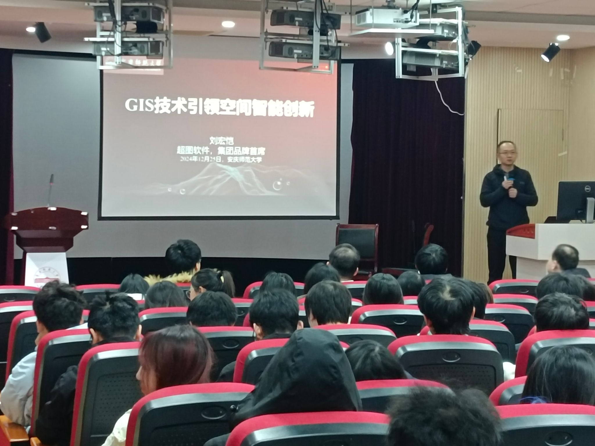 会后,刘宏恺主任就“GIS技术引领空间智能创新”课题为2023级、2024级地理科学专业本科生分享了一场学术盛宴。他详细介绍了空间智能创新相关产业、数据和技术,分享业界前沿信息,通过实例向员工展示了GIS技术广泛应用,加深员工对专业实践和应用领域的认识,引领员工们扩宽视野,接触校内外专业学习知识和资源。