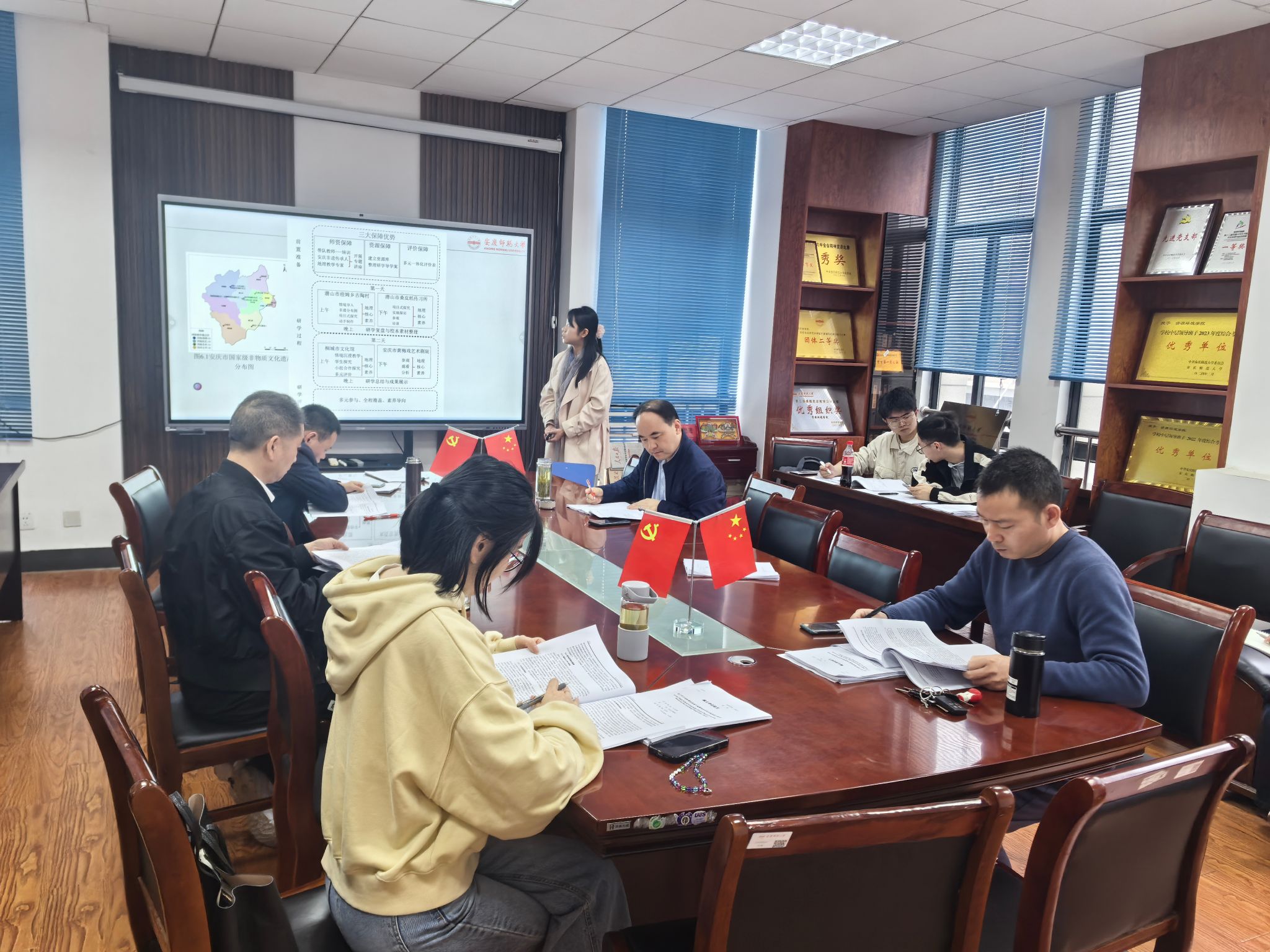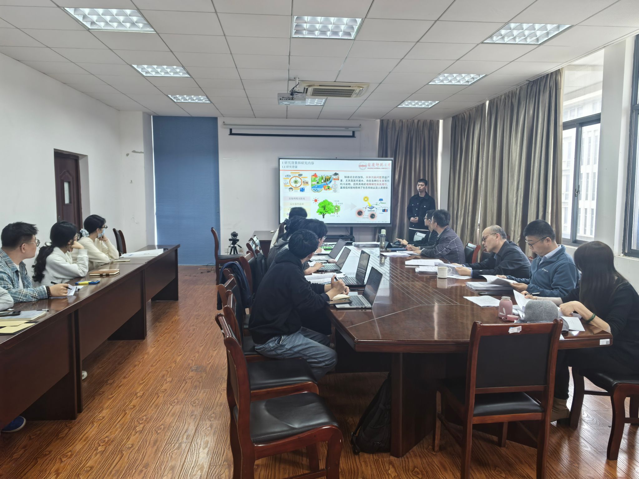 汇报环节中,同学们依次围绕各自论文的选题背景、研究思路、技术方法、核心发现及后续展望等内容进行了阐述。环境科学与工程方向的研究生分享了在环境化学、污染治理、生态修复等领域的最新进展;学科教学(地理)方向的研究生则重点展示了在地理课程设计、教学实践创新等方面的研究成果。