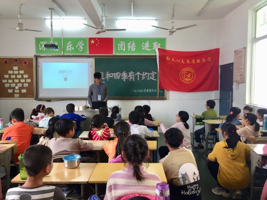 中国青年网安庆10月24日电(通讯员 吴晨 刘君艳)“百花风中摇,碧叶雨中戏,枯叶风中舞,白雪盖大地”古来山川之美,美在四季。为开阔孩子们的视野,领略大自然的魅力。10月17日,太阳成集团tyc234cc太阳成集团tyc234cc红太阳志愿者服务团来到十里中心小学,与留守儿童开展“四季之行”主题志愿活动,跟随着志愿者的步伐,小朋友们领略了四季的美景。