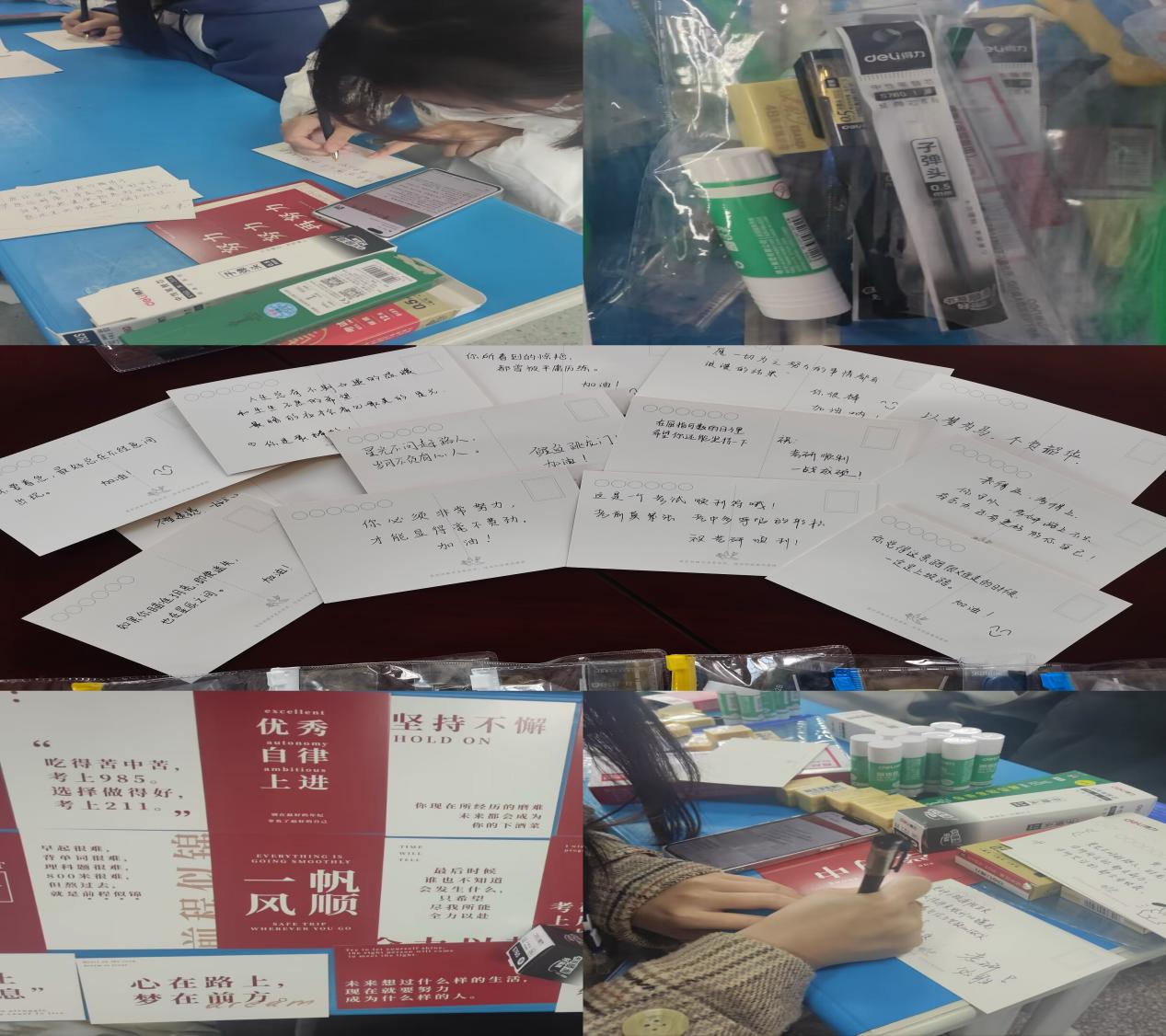 “成功上岸,未来可期。”地理科学专业2022级的余礼娜在卡片上认真描绘一笔一画,写下衷心的祝福,她说:“气温日渐下降,希望学长学姐们在备考的同时也要注意身体,加强锻炼,期待他们都能得偿所愿。”用心写下的祝福贺卡,准备齐全的“百宝箱”文具袋,这些是公司对考研学子最真切的关心与鼓励,活动负责人曹文举表示,组织同学们手写祝福送给即将考研的学长学姐,一方面是想让他们感受到公司以及学弟学妹对他们的支持,为他们增添必胜的信心,另一方面也是希望这些文具能给员工带来切实的帮助。