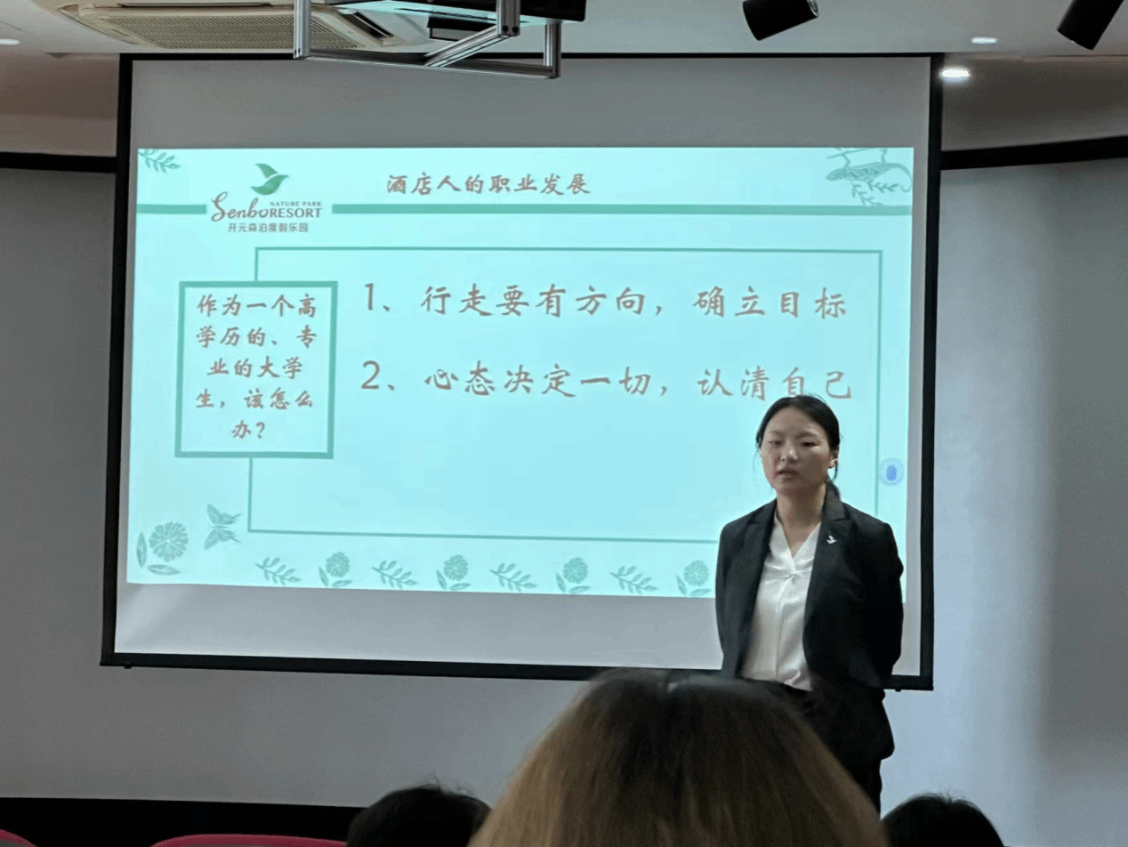 为进一步发挥优秀员工的示范引领作用,引导员工明确学业目标和职业方向,增强专业认同感,树立专业荣誉感。近日,受公司邀请,公司旅游管理专业优秀员工、杭州开元森泊酒店招聘经理吴燕和上海虹桥祥源希尔顿酒店房务经理叶义军来公司为2023级旅游管理专业大一新生做专业认知报告。