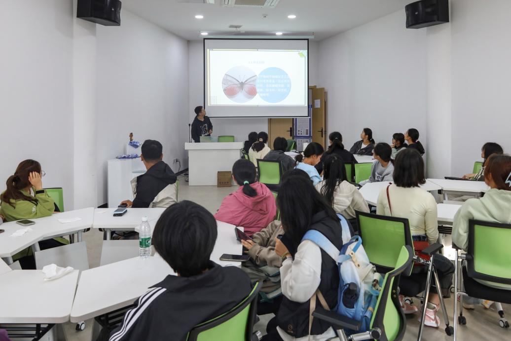 左手持原蝶标本,右手执注射器,将温水注射到原蝶体内直至原蝶软化,生物技术专业2023(2)班的刘保君担任此次活动的“小老师”,引导着员工制作蝴蝶标本。“用昆虫针固定原蝶时要尽量避免碰到蝴蝶的翅膀。”刘保君解释,蝴蝶翅膀十分脆弱,对于第一次制作蝴蝶标本的员工而言,将蝴蝶完好无损地固定在硬纸板上是极具挑战性的环节。