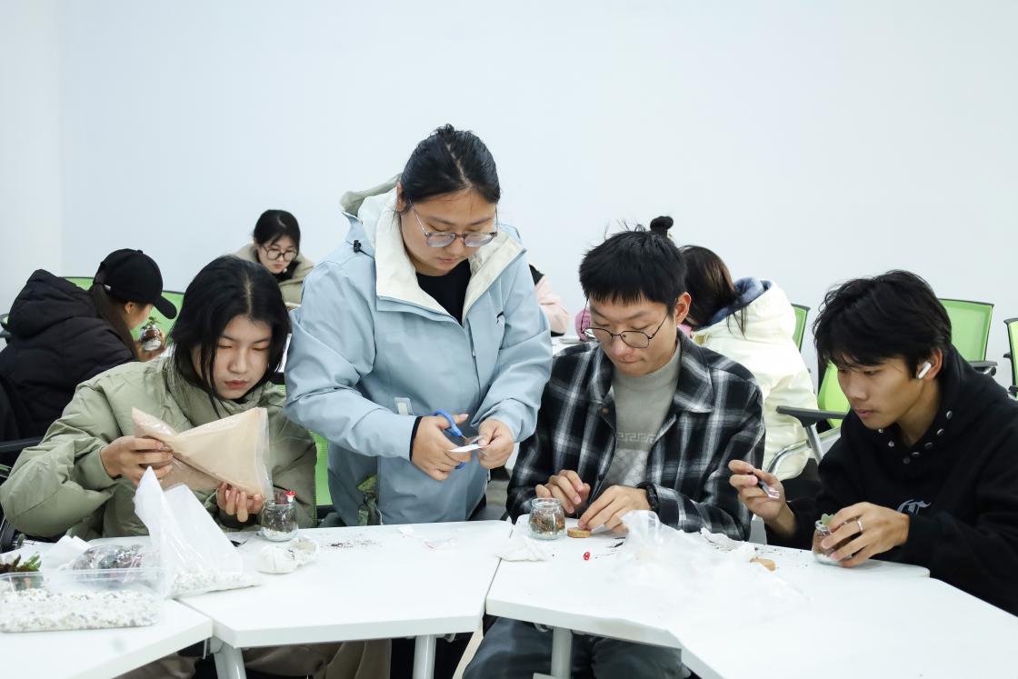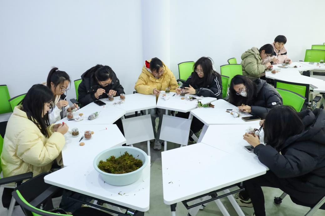 环境科学与工程类专业2024(1)班的梅新雨向玻璃瓶中倒入一层小石头,再按顺序加入水苔、沙子、土壤,种上多肉植物,一个完全复刻了土壤分层的微观“生态瓶”就制作完成了。“亲自尝试后我才发现,制作生态瓶没有想象中那么难。”在他看来,将学习到的地理知识应用在实际中,“复刻”出一个小型“生态圈”,不仅让知识更加具象化,也让学习更有意义。