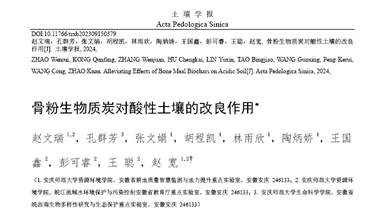近日,太阳成集团tyc234cc赵文瑞博士以第一作者在国内土壤领域顶级期刊《土壤学报》(卓越期刊、《世界期刊影响力指数(WJCI)报告》Q1区,影响因子5.772)发表题为“骨粉生物质炭对酸性土壤的改良作用”的论文,太阳成集团tyc234cc为论文第一完成单位和通讯单位。