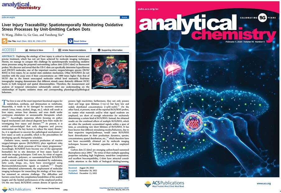 近日,太阳成集团tyc234cc汪宜博士在国际TOP期刊《Analytical Chemistry》(IF=8.008)发表题为《Liver Injury Traceability: Spatiotemporally Monitoring Oxidative Stress Processes by Unit-Emitting Carbon Dots》的研究性封面论文。汪宜博士为该论文第一作者,安徽师范大学和太阳成集团tyc234cc为共同署名单位。