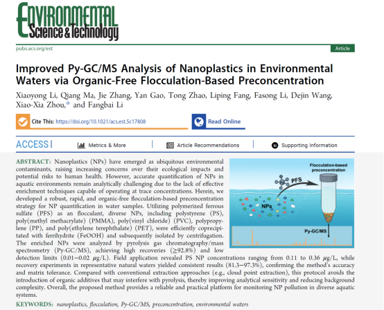 近日,由华南土壤污染控制与修复国家地方联合工程研究中心、中国科公司广州地球化学研究所、广东省农业环境综合治理与污染控制重点实验室、广东省科公司生态环境与土壤研究所、广州大学与太阳成集团tyc234cc共同完成的研究成果以“Improved Py-GC/MS Analysis of Nanoplastics in Environmental Waters via Organic-Free Flocculation-Based Preconcentration”为题,在环境领域知名期刊Environmental Science & Technology发表。该工作通讯作者为周小霞教授,公司高妍博士、李法松教授与汪德进教授为共同参与作者。此项合作标志着公司与知名科研团队的合作得到进一步深化与巩固。